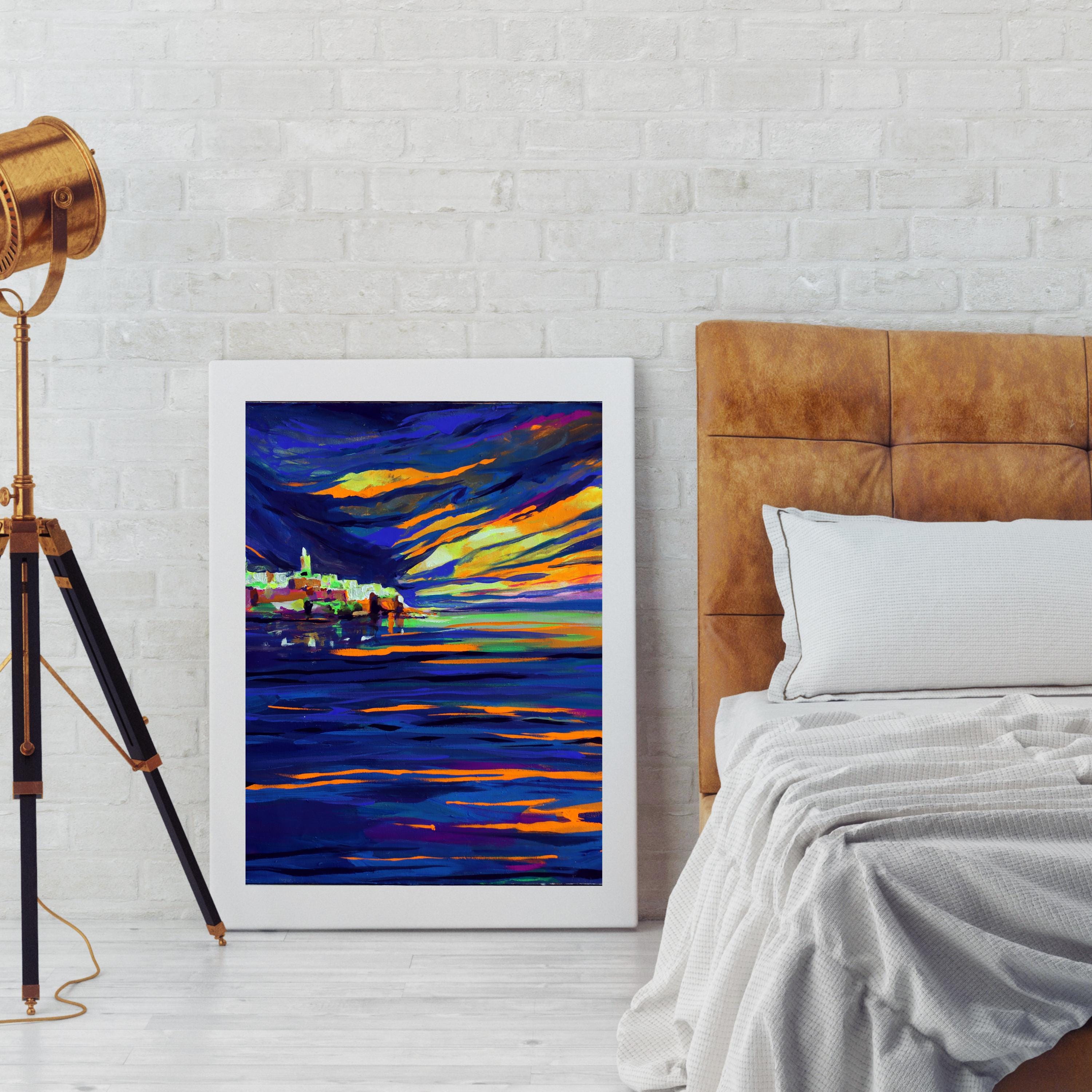 Landscape paintings work beautifully above beds because they create a sense of depth and relaxation. The artworks you uploaded featuring deep blues, sunset oranges, and expressive brushstrokes bring warmth and calm to the room. They’re ideal if you want a bedroom that feels peaceful and artistic.