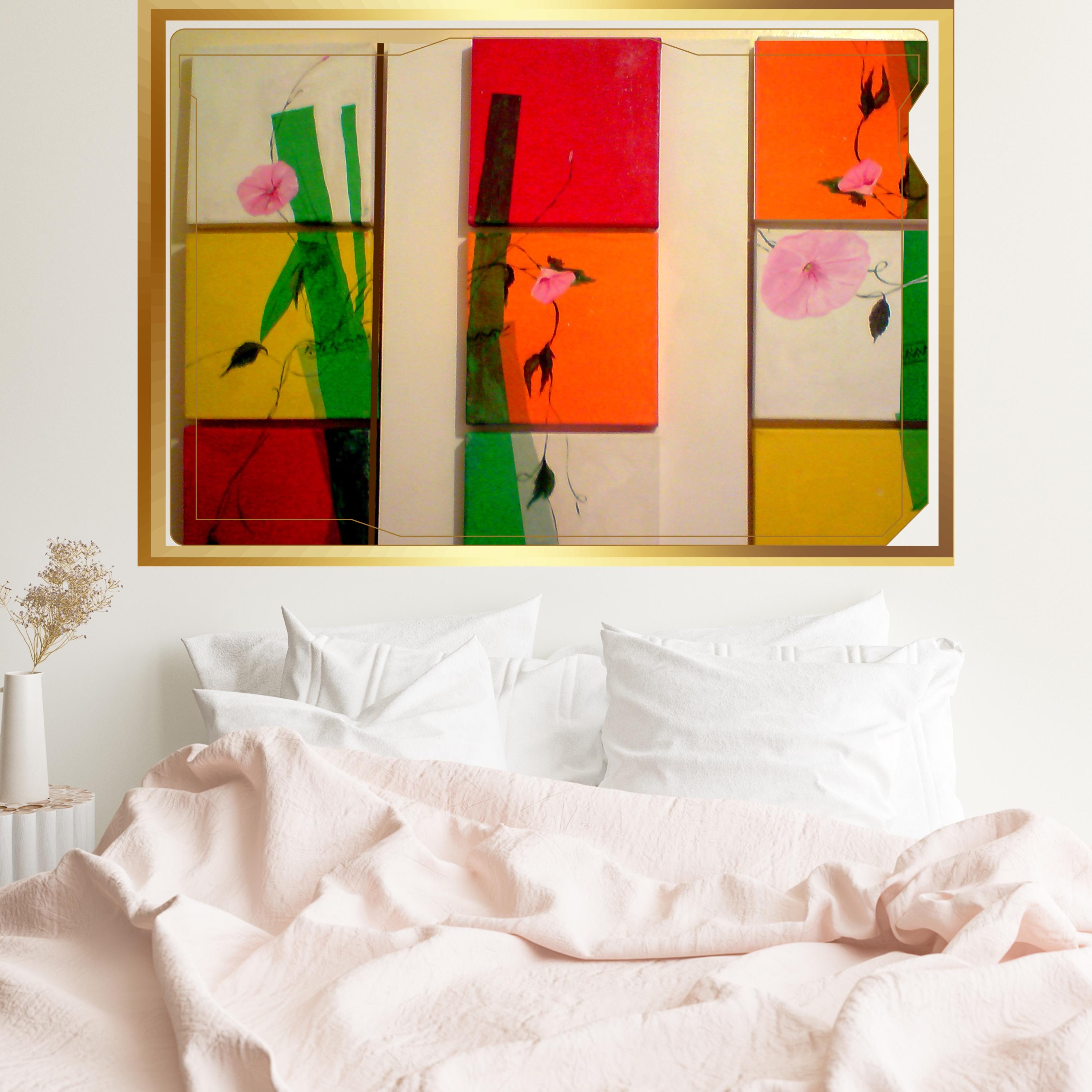 In the first artwork you provided, the vibrant mix of red, green, orange, and yellow panels adds energy to a neutral bedroom. This type of piece works perfectly when: